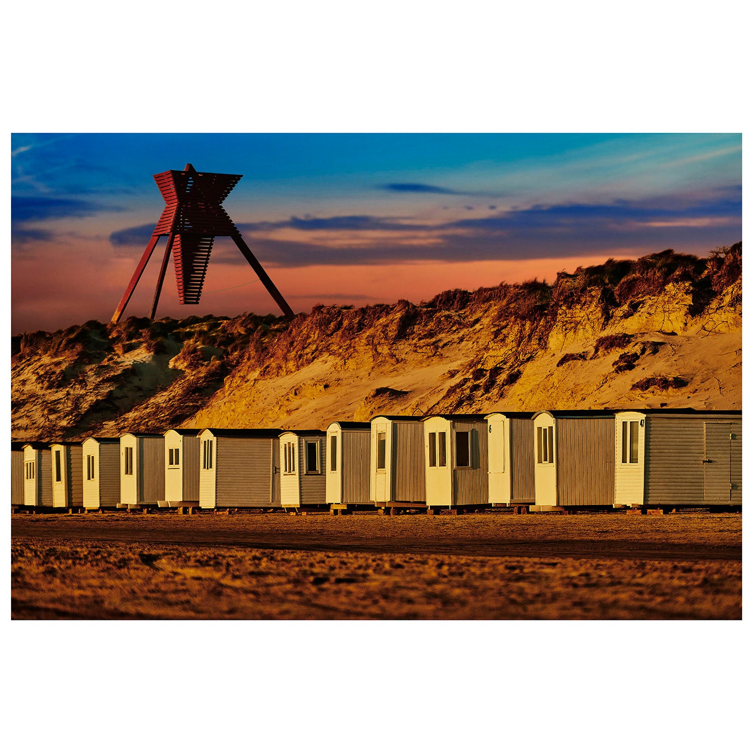 Blokhus danner rammerne om en populær ferieby i det nordlige Jylland. På dette 1000 brikkers puslespil illustrerer motivet de smukke hvide badehuse, der hver sommer bliver sat frem på den danske vestkyst ud for både Blokhus og Løkken. Bagved dem står det historiske sømærke, der er byens største vartegn, i de store klitter.